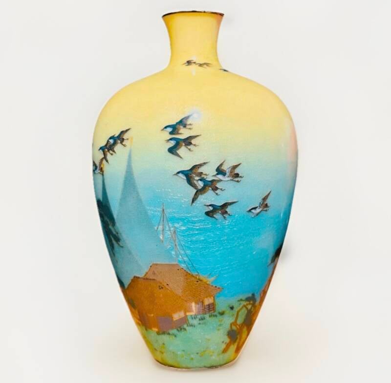 This stunning vase depicts herons flying and landing on rocks that are being lashed by waves on a beautiful teal ground. The detail is absolutely phenomenal.