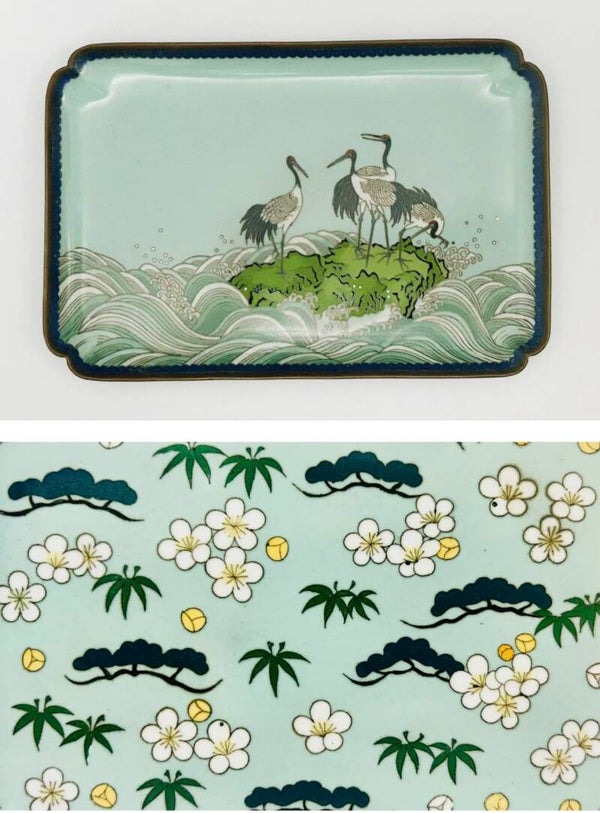 A Japanese Cloisonne tray with herons on wave lashed rocks!